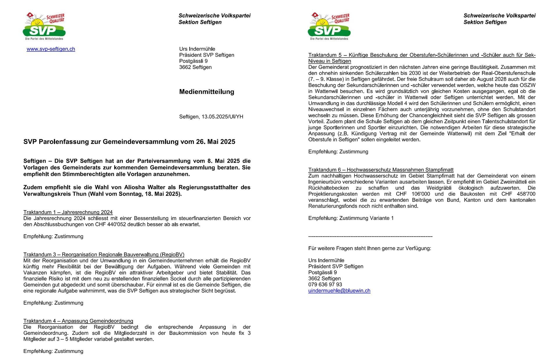 12.05.2025 SVP Parolenfassung zur Gemeindeversammlung vom 26. Mai 2025